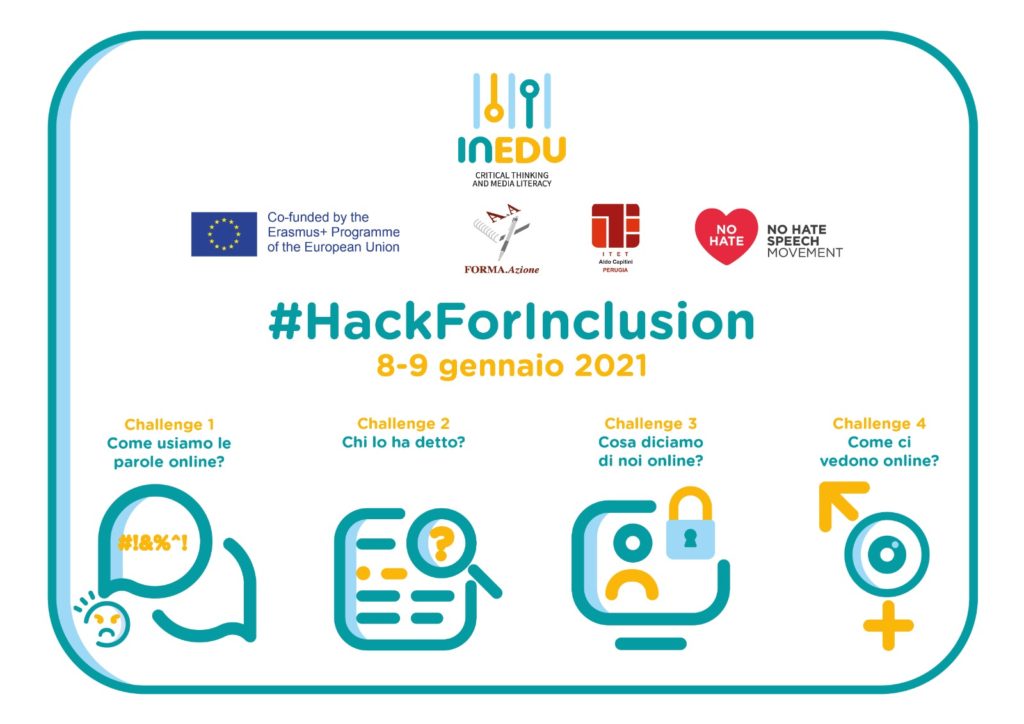 Perugia, 4 gennaio 2021 -Si terrà l’8 e 9 gennaio 2021, il Civic Hackathon italiano “HackforInclusion”, rivolto a studenti e studentesse delle scuole superiori italiane, del progetto Erasmus + “IN-EDU”, ideato dal gruppo FORMA.Azione, unico centro di coordinamento in Umbria del No Hate Speech Movement Italia, la campagna istituita dal Consiglio d’Europa che punta a sensibilizzare le persone in materia di lotta all’odio, all’intolleranza e alla violenza on line; e che vede come partner umbro di progetto, l’ITET Capitini di Perugia, scuola polo per l’inclusione della regione Umbria.