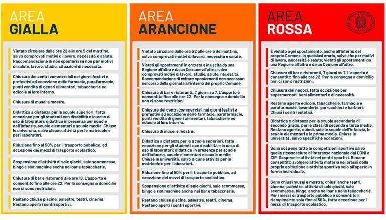 Ecco perché cinque Regioni passano ora in zona arancione, con maggiori restrizioni dunque, aggiungendosi a Puglia e Sicilia, e una provincia passa a rossa, come Calabria, Lombardia, Piemonte e Valle d’Aosta.