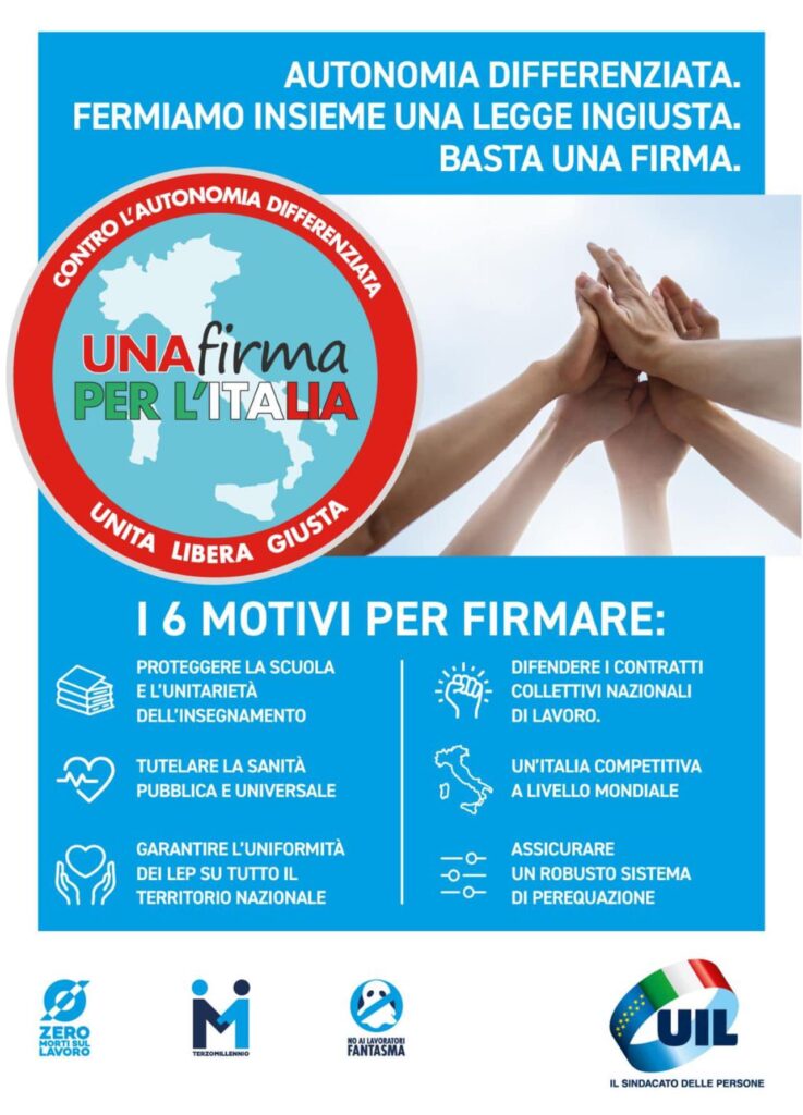 “Sì all’Italia unita, libera e giusta. Una firma contro l’Autonomia differenziata”, questo lo slogan della mobilitazione che punta a raccogliere entro settembre le 500.000 firme necessarie. “La legge sulla autonomia differenziata – fa sapere il Comitato referendario – va abrogata perché: spaccherà l’Italia in tante piccole patrie, condannando il Paese all’irrilevanza politica ed economica anche a livello europeo; aumenterà i divari territoriali; peggiorerà le già insopportabili disuguaglianze sociali a danno di tutta collettività e, in particolare, di lavoratrici e lavoratori, pensionate e pensionati, giovani e donne; moltiplicherà la burocrazia, complicando la vita alle imprese”. Per questo un arco così ampio di realtà propone alle cittadine e ai cittadini di sottoscrivere il referendum, il cui quesito recita: “Volete voi che sia abrogata la legge 26 giugno 2024, n.86, ‘Disposizioni per l’attuazione dell’autonomia differenziata delle Regioni a statuto ordinario ai sensi dell’articolo 116, terzo comma, della Costituzione’?”. Sì all’Italia Unita Libera e Giusta.