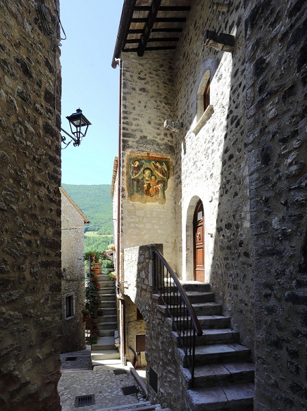Al termine dell’escursione di domenica 26 marzo si visiteranno le emergenze culturali del paese-monumento di Vallo di Nera tra cui le tre chieseposte ai vertici di un ideale triangolo creato dalle antiche mura di cinta: San Giovanni Battista, la Chiesa parrocchiale in alto, la Chiesa di Santa Maria Assunta e all’altro vertice la Chiesa di Santa Caterina d’Alessandria una chiesa auditorium che conserva una tela d’altare del XVII secolo, che rappresenta lo sposalizio mistico di Santa Caterina d’Alessandria, oltre a frammenti di affreschi trecenteschi. Alla chiesa di santa Caterina, inserita tra le due torri della cinta muraria, una circolare e l’altra a pianta squadrata, si arriva percorrendo l’omonina via Santa Caterina, una strada pressoché interamente affrescata di cui oggi rimane solo una Maestà, inusuale per la importante qualità dell’opera poiché posizionata in strada, al di fuori di un edificio di culto, recentemente recuperata, risalente al 400 ed attribuita ad un Maestro umbro del xv secolo, che rappresenta una Madonna in trono con Bambino ed angeli reggi cortina.